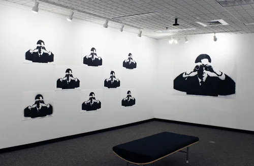 Insomnia is a condition of absence and desire. One has insomnia in the way one has any other thing, but it is an absence, the absence of sleep. The project incorporates five sets of pieces, each of which can stand alone as an independent statement, however, the sets were conceived as flexible modules that may be combined into an installation involving a variable number of components. Digital elements as well as physical media that rely on stencils, formulae and other reproducible forms for its realization, emphasize the theatrical nature of exhibition. Components may be reconceived or refabricated to address particular spaces or situations. The Insomnia project has been shown in whole or in part in exhibitions variously titleed Insomnia, The Same Thing Every Night, Up All Night and The Late, Late Show.
