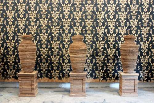 Time's Up, 2018, stacked cardboard and wood products, 80" x 46" x 46"